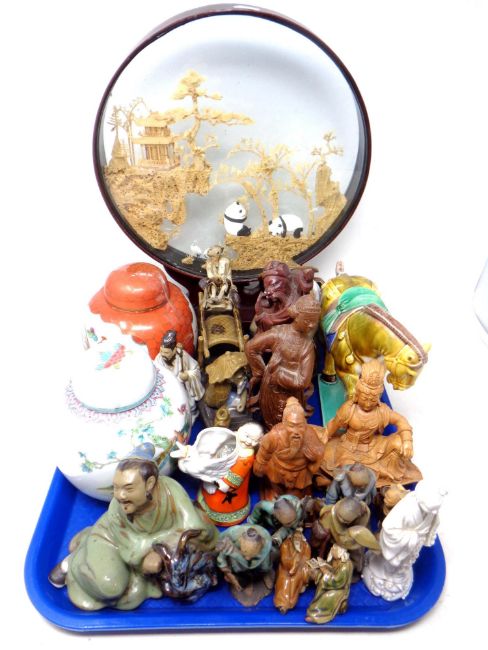 A tray of Chinese ceramics and carvings including pottery Tang style horse, ginger jars, figures of Chinese elders, Bamboo diorama in case