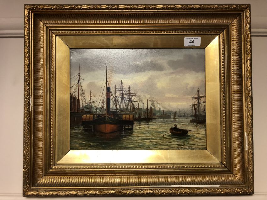 Bernard Benedict Hemy (1845 - 1913) : A Paddle Steam Pilot Boat and Other Shipping on a Busy River (Probably The Tyne), oil on panel, signed, 31 cm x 39 cm, with the label verso "T. Rushworth & Son, Carvers and Gilders, Sadler Street, Durham" as well as the artist's biography taken from Marshall Hall, framed.