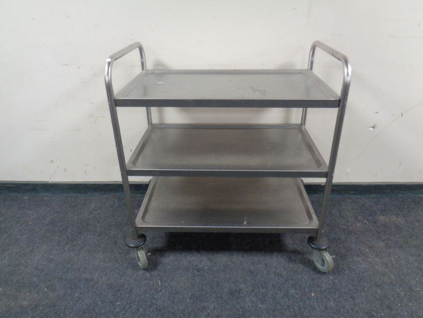A three tier stainless steel trolley.
