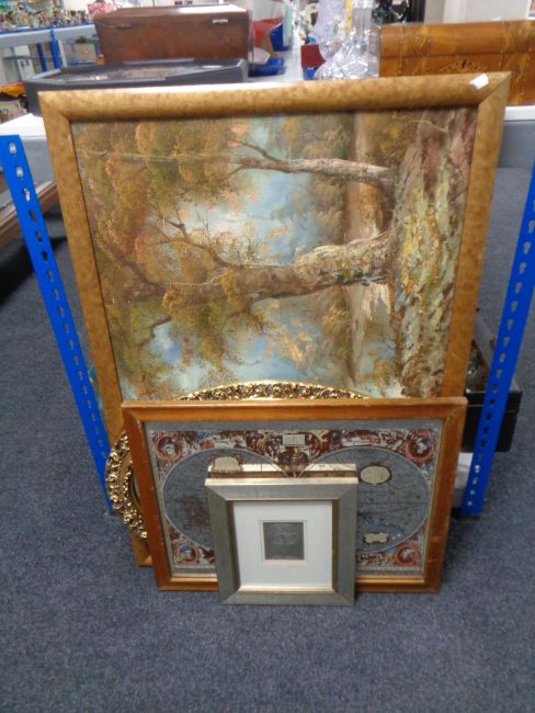 An oil on canvas depicting woodland together with a gilt framed mirror, a mirrored map of the world, further gilt framed bevelled mirror.