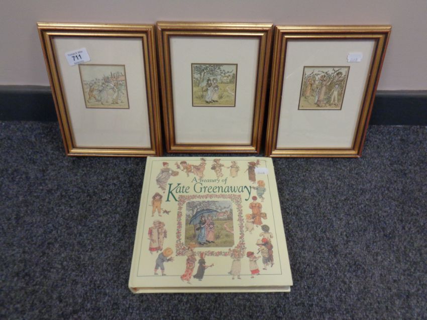 Three Kate Greenaway colour prints depicting children together with one volume 'A treasury of Kate Greenaway'.