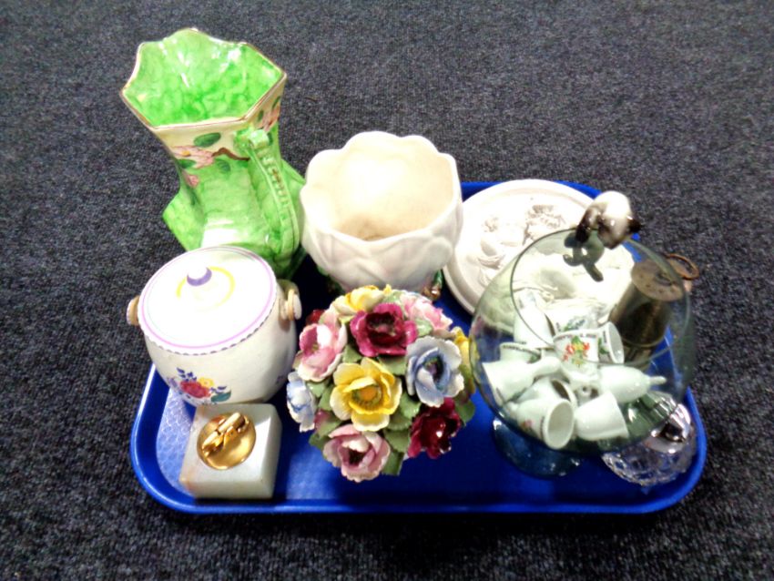 A tray of Maling floral jug, Sylvac vase, Poole Pottery storage container, brass miner's lamp.
