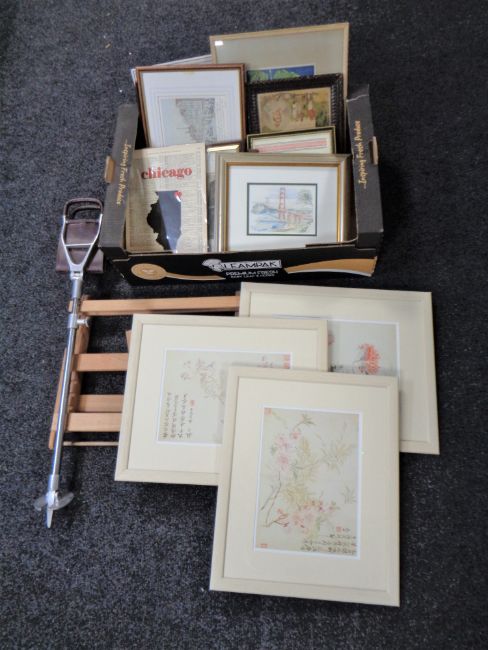 A collection of pictures and prints, an artists table easel, a shooting stick.