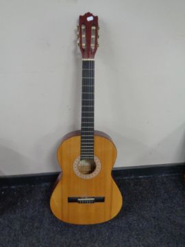 An Encore acoustic guitar.