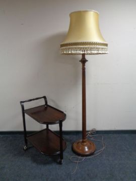 A mahogany standard lamp with shade together with a mahogany trolley.