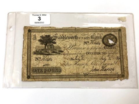 A provincial banknote Saddleworth Union Bank, One Pound, 1824, signed by John Harrop, scarce, this bank failed in 1826