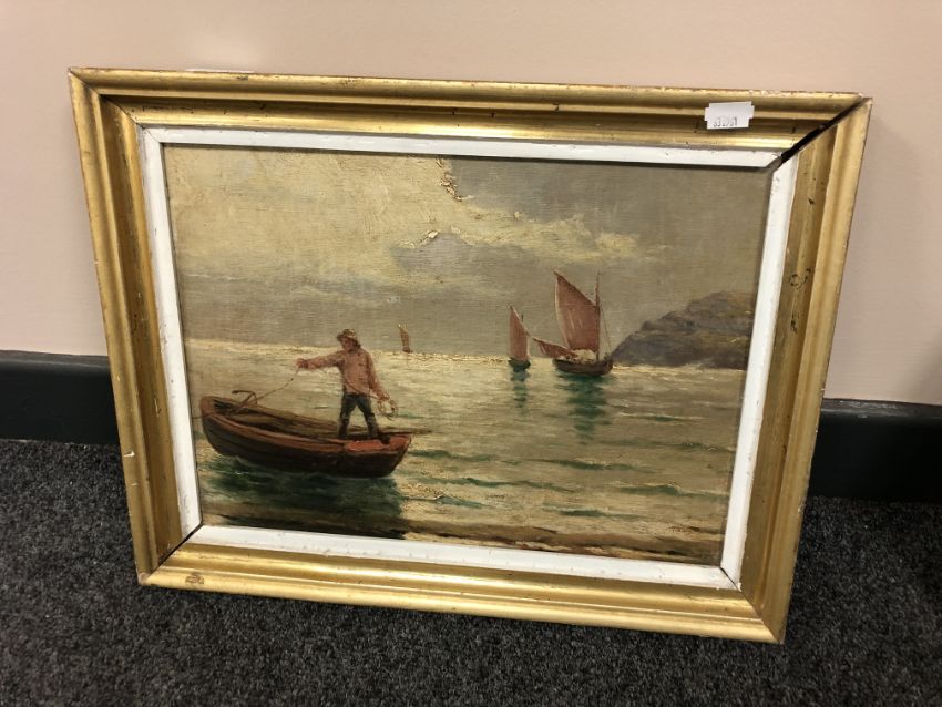 E Hanslip : Figure in a rowing boat at sunset, oil on board.