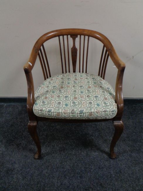 An Edwardian beech framed salon tub chair.