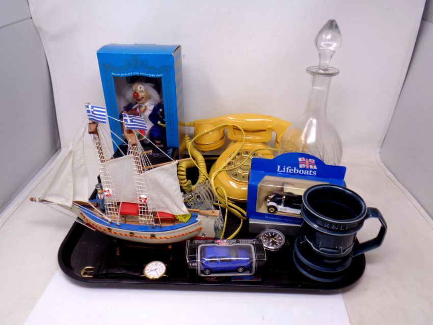 A tray of mid century telephone, crystal paperweight, boat figure, die cast car etc