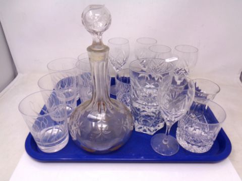 A tray of glass and crystal including a decanter.