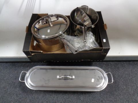 A stainless steel fish kettle together with further stainless steel pans etc.