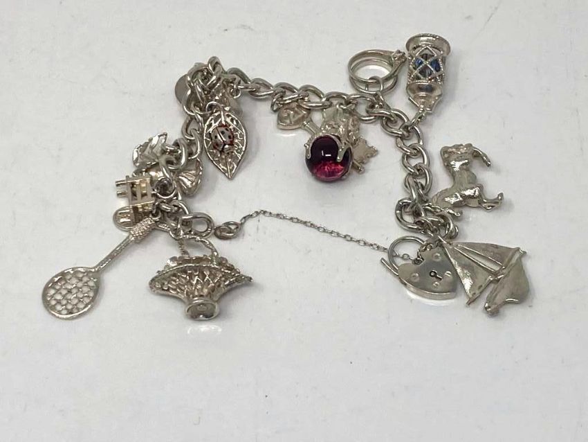 A silver charm bracelet with fourteen charms