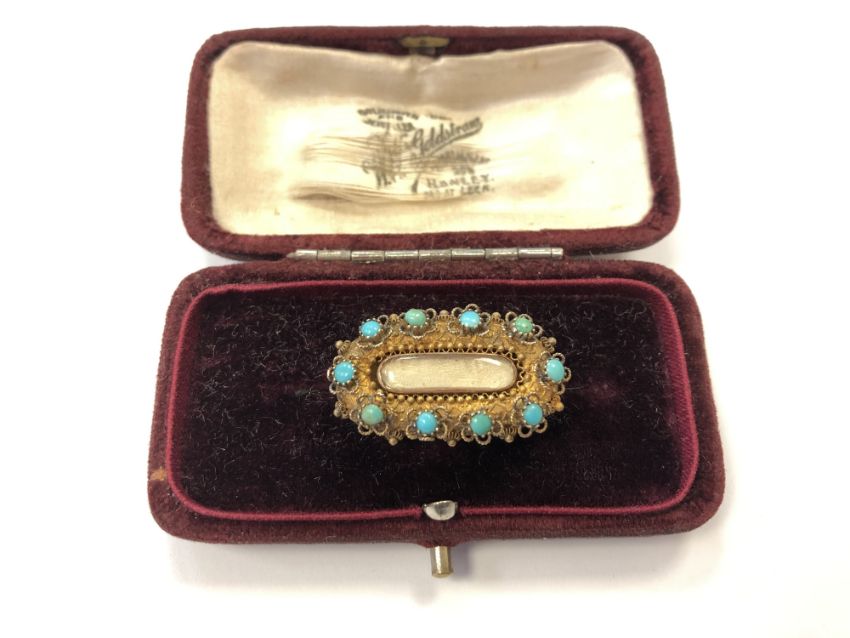 A Georgian yellow gold and turquoise memoriam brooch, solid back, 5.7g.