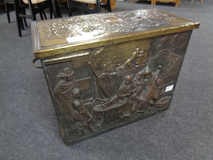 A late 19th century Belgian embossed brass storage box by A. Arens and Co., makers name stamped to top