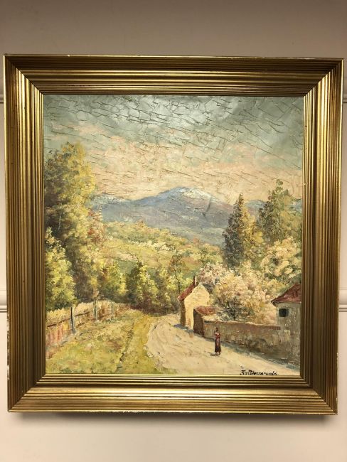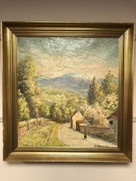 Finn Ulennerwauld : Figure on a lane by a walled garden, oil on canvas, 49 cm x 53 cm, signed