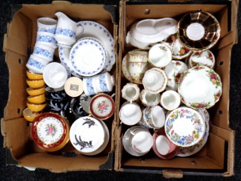 Two boxes of various tea chine including Royal Albert Old Country Roses, Shelley Hedgerow, Paragon Monaco etc