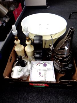 A box containing a pair of table lamps with shades, contemporary vase, boxed Leonardo Collection teacup and saucer etc