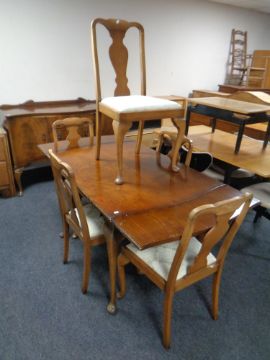 A walnut serpentine front sideboard fitted with cupboards and drawers with a matching extending dining table and set of six chairs