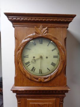 A continental pine longcase clock with painted dial, pendulum and weights