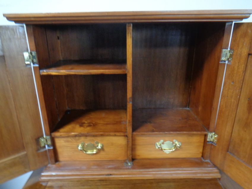 An Edwardian pine double door countertop cabinet with fitted internal shelves and drawers