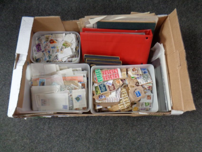 A box containing 20th century world stamps, loose, in covers and in two vintage Players Navy Cut tins