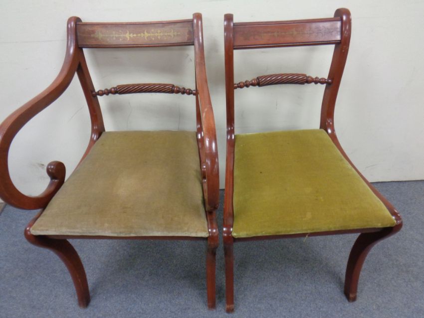 A Regency style inlaid mahogany twin pedestal dining table with leaf, together with a set of eight chairs with brass inlay