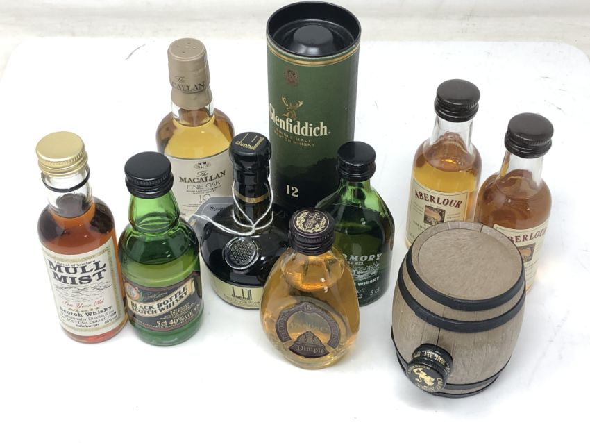 A collection of ten whisky miniatures to include - Coopers Choice 10 year Malt, Glenfiddich 12 year old single malt, Mull Mist 10 year old, Macallan fine oak 10 year single malt, Dimple 15 year old, Aberlour 10 year single malt (2), Tobermory Malt, Black Bottle Scotch and Dunhill finest Scotch. (10)