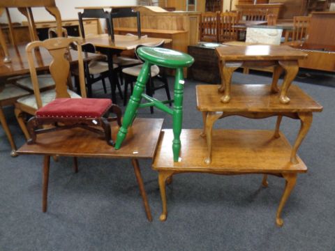 A group of occasional furniture comprising two stools, three oak low tables and one further table