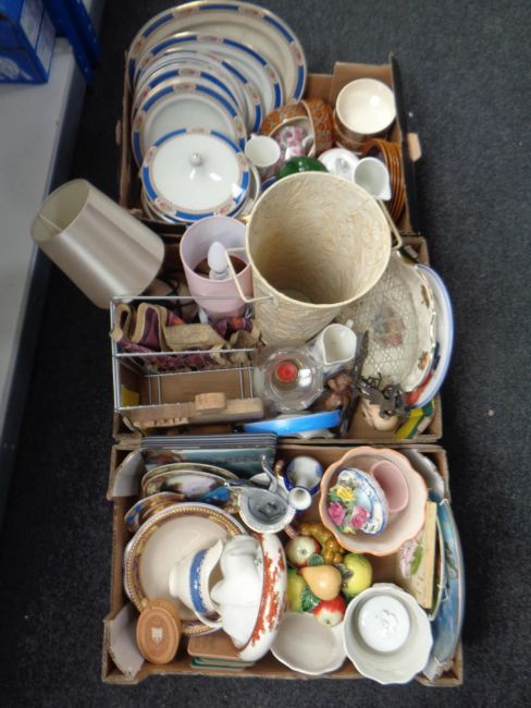 Three boxes containing Cauldon blue and gilt dinner china, ornaments, table lamps etc