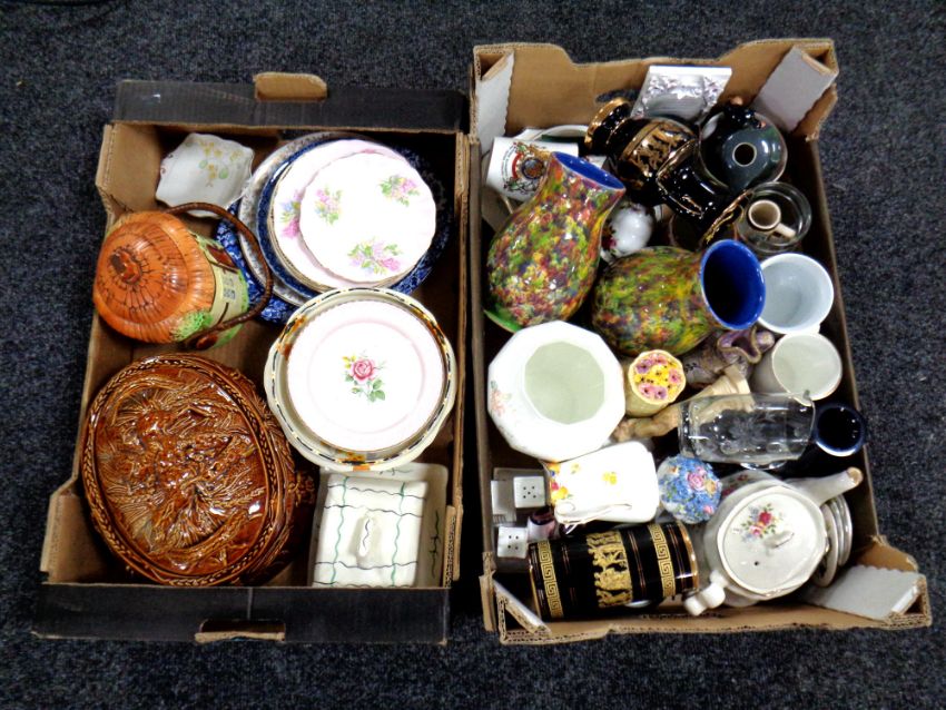 Two boxes containing tea china, pottery game tureen, butter dish etc