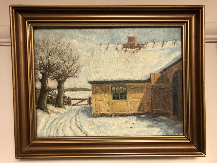 Continental School : A snow covered barn, oil on canvas, signed with initials dated '48, 31 cm x 23 cm