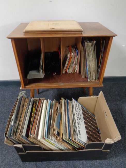 A box and record cabinet containing a quantity of LP records and singles including classical etc