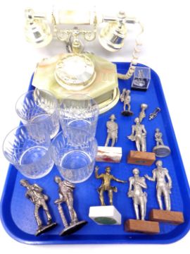A tray containing assorted metal figures including French soldiers, an onyx rotary telephone together with a set of four Edinburgh crystal whisky tumblers.