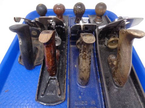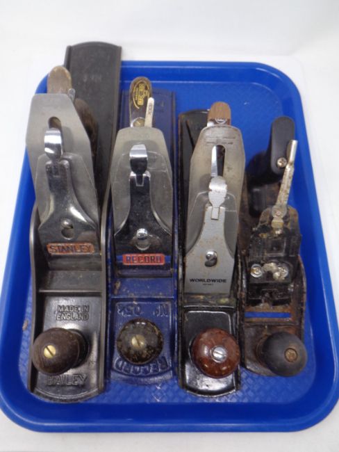 A tray containing four assorted woodworking planes including, Record No.5 and 1/2, Stanley Bailey No.6 and No.5 etc.
