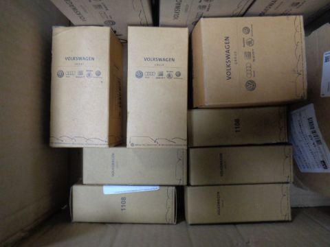 A box containing Volkswagen group car parts including, air filters, oil filters, injectors etc.