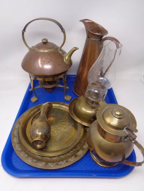 A tray containing antique and later brass and copper wares including an Art Nouveau spirit kettle on stand, eastern brass trays, a brass teapot, copper jug etc.