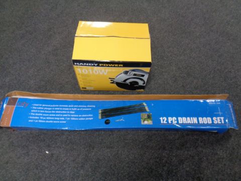 A Handy Power 1010W electric hand saw together with a 12 piece drain rod set (boxed).