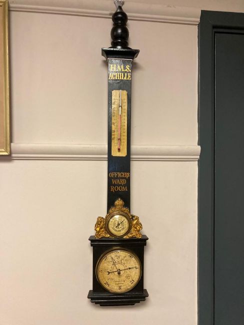 A painted wooden barometer / hygrometer 'HMS Achille', length 85 cm.
