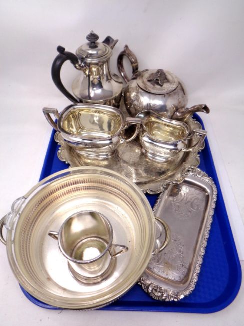 A tray containing assorted plated wares including serving tray, tea ware etc.