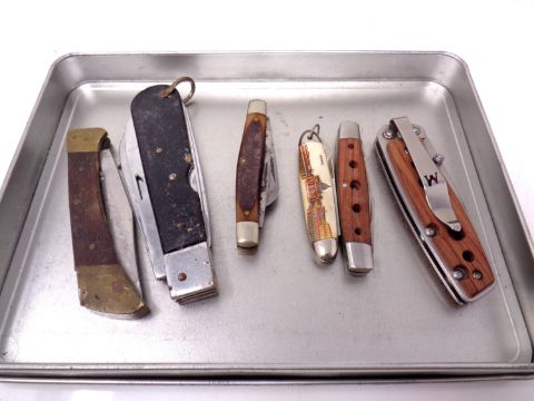 Six assorted pocket knives.