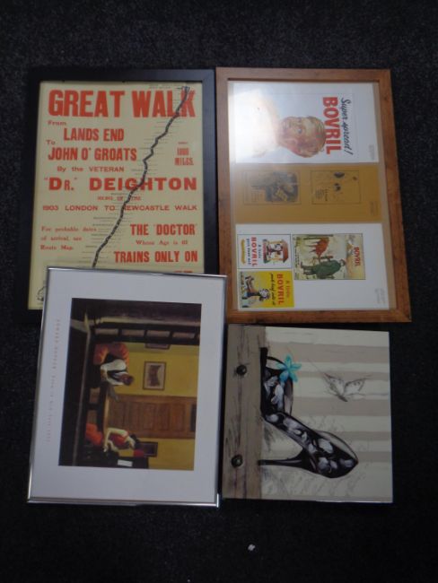 A reproduction Bovril great walk poster together with a further Bovril montage and an Edward Hopper 'Room in New York' print together with a wall panel.