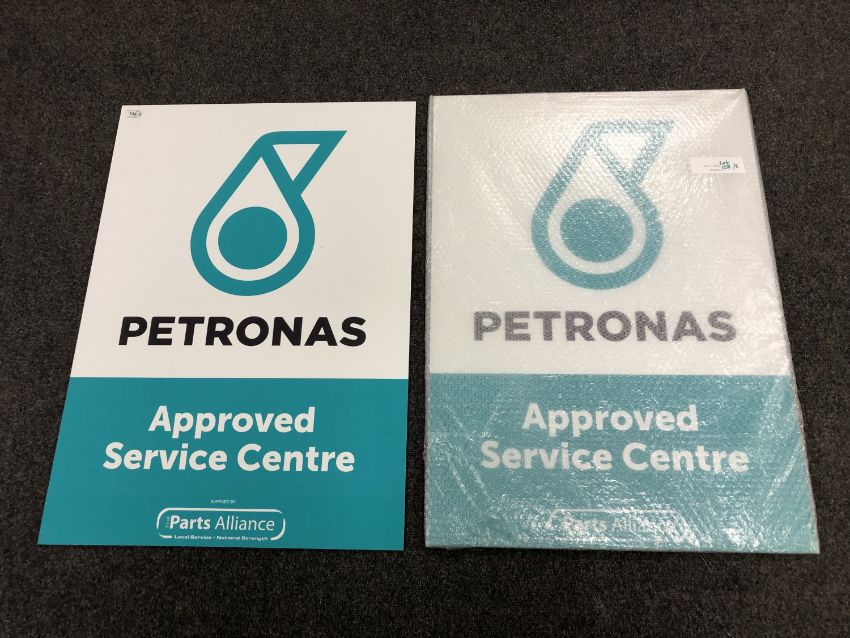 Three advertising signs : Petronas - Approved Service Centre, both the same, each 84 cm x 60 cm. (3)