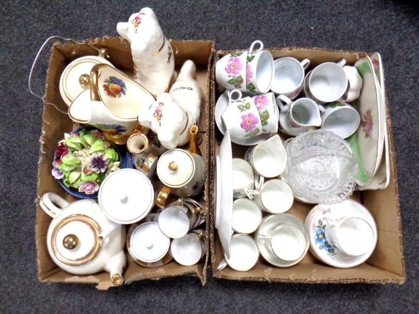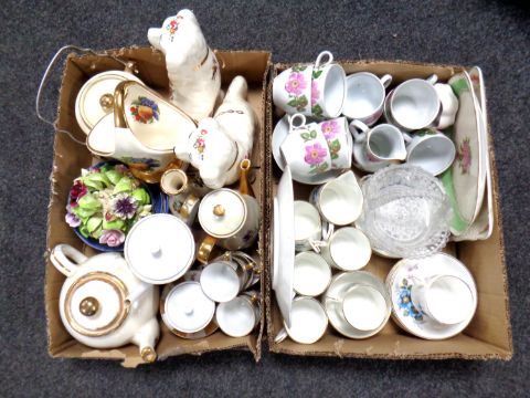 Two boxes containing a pair of Staffordshire style dogs, assorted Continental and English tea china, a china flower posey etc.