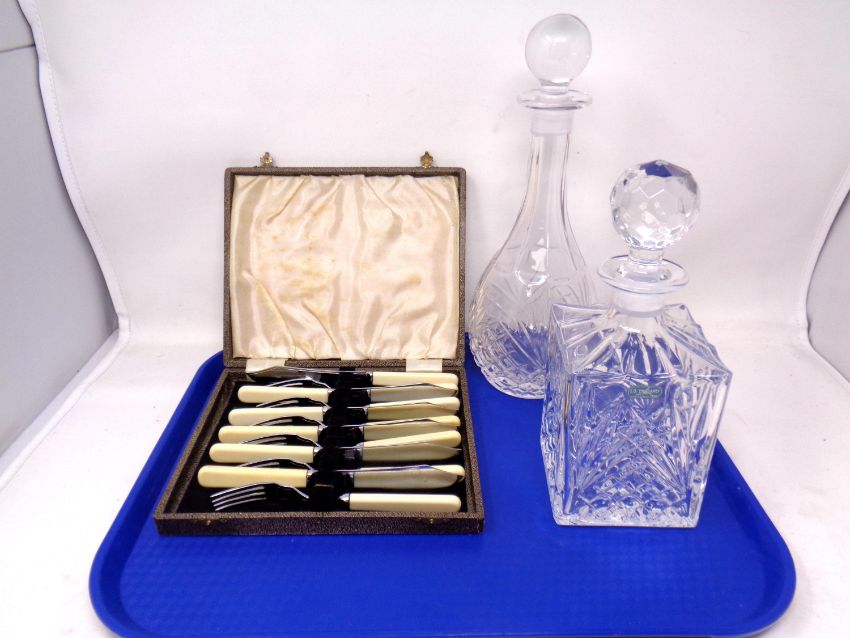 A tray containing two lead crystal decanters, one by J. G. Durand together with a cased set of fish cutlery.