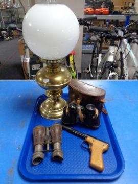A tray containing a Diana model 2 air pistol, two sets of field glasses (one in leather case) together with a brass oil lamp with chimney and shade.
