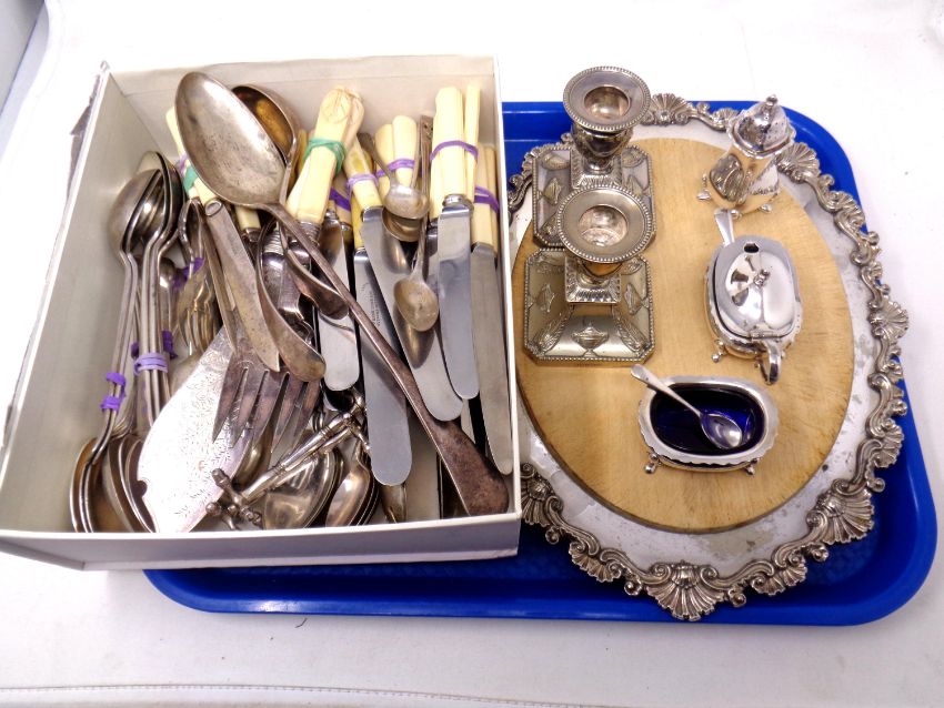 A box containing a quantity of stainless steel and silver plated cutlery, serving spoons, ladles, silver plate, wooden chopping board, a pair of candlesticks and a three piece cruet set.