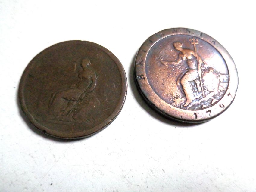 A box containing a large quantity of foreign coinage, Victorian and Georgian pennies, a 1797 George III cartwheel penny etc.