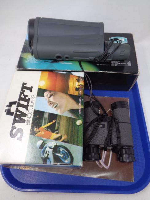 A Yukon rubber armoured compact variable power spotting scope (boxed) together with a pair of Swift 8x30 binoculars (boxed) with a Swift binoculars book