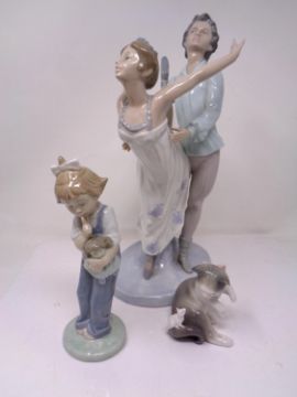 Three Lladro and Nao figures including Kitten with mouse, Girl with doll and Dancers. (AF)