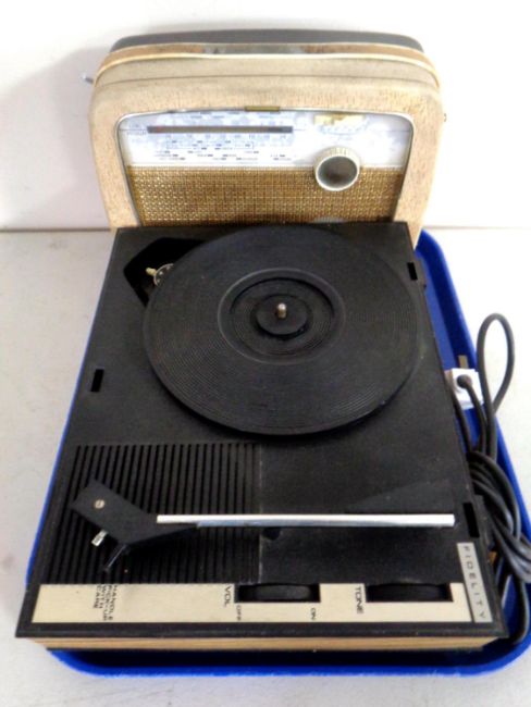 A Defiant transistor radio together with a Fidelity electric portable record player